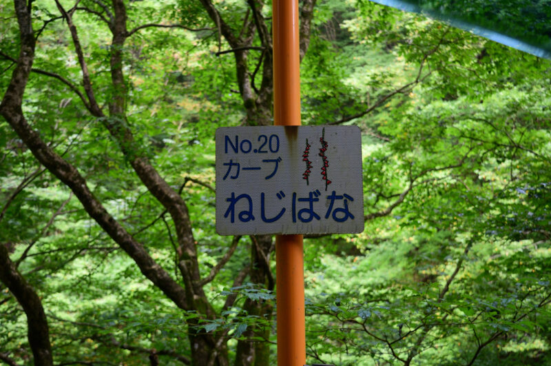 幽玄郷の中を進んでいくと、20番カーブのおなじみ草花をモチーフにした看板が現れる。今回は「ねじばな」。