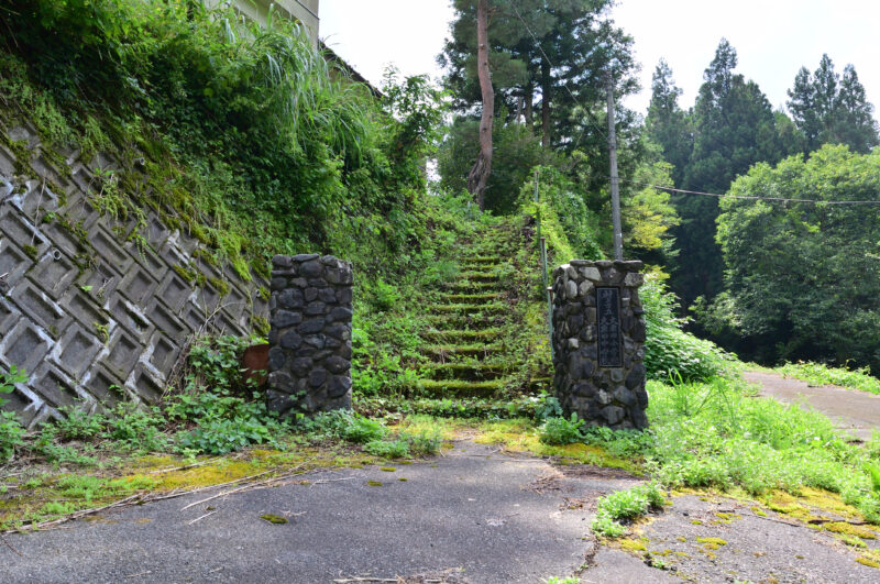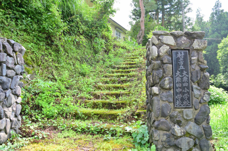 体育館を横目に県道を進んでいくと、一段高いところにこうした広場があって、そこに立派な門柱が立っていた。それがこれだ。石を四角柱に積み重ねた練石積みの柱だ。そこには立派な銘板がはめ込まれている。そして、その奥には草生した、なんとも歴史を重ねていそうな重厚な階段が見える。ここが大栗田小中学校の校門だろう。非常に立派な校門で、最盛期には多くの子供たちがここを通って校舎に駆け抜けていったことだと思う。しばらく目を閉じていると、子供たちの喧騒が聞こえてきそうだ。