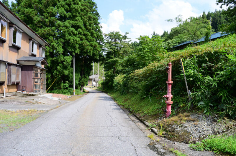 集落の中の道のようにも見えるが、県道だ。木の電柱が現役で使われているのも。また良い。その横には消火栓。いろんな建物が立っているが、ここから見える建物はすべてシャッターが閉まっており、農業倉庫か農機具倉庫のようにも見える。やはりここも過疎化なんだろう。ここまで集落の中を通ってきたが、人影は見なかったし、車もすれ違わなかった。こういった道は「険道(県道)」として珍しくないが、ここは特別。まるで時間が止まったままの道、そんな感じがした。