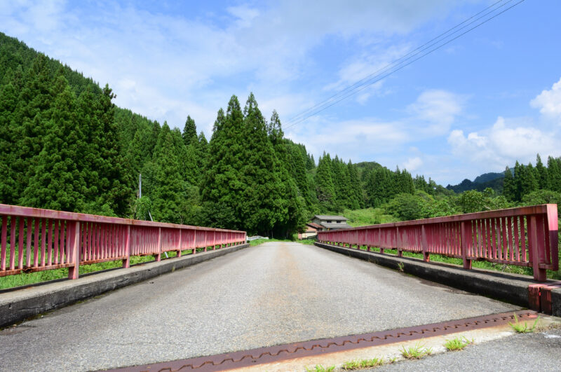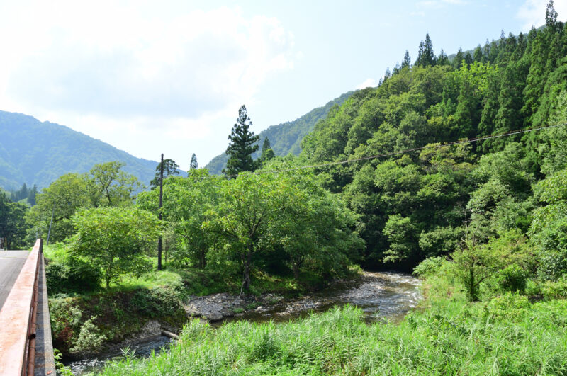 集落を抜けると橋が登場してきた。おそらく、この橋が県道の最後の橋だろう。その向こうには家屋が1軒見える。あの家屋は集落より少し離れた建物、冬に雪が降ったら…などと考えてしまうと、その生活は大変だったに違いない。だからこの道が大栗田集落への交通を守るために林道から県道に昇格したんだろう。となると、向こうに見えるあの家のあたりが県道の終着点のはず(厳密にいうと「起点」だけど)。ところで、この橋が渡っている川は?と思って、高欄から川を覗くと…