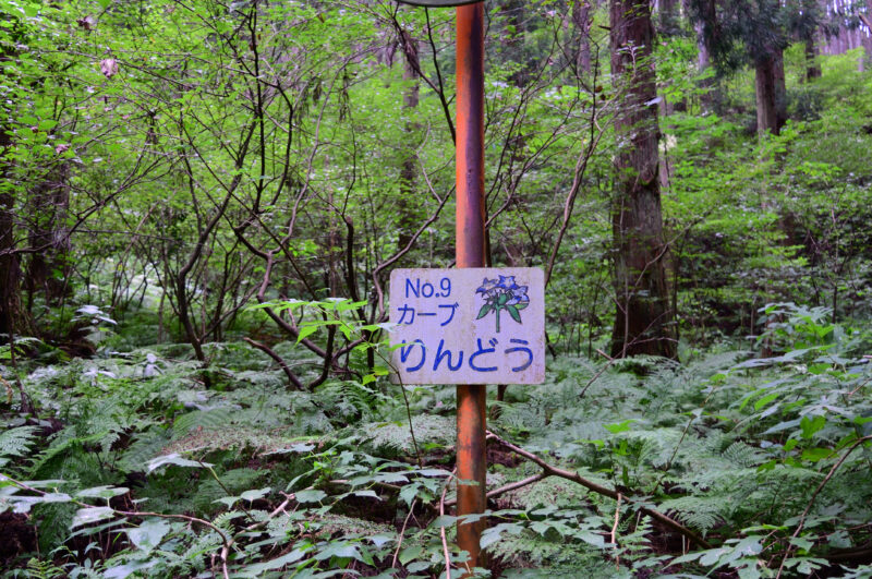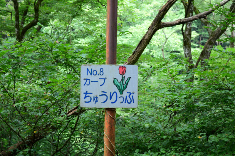 先に進んで現れたのは、8番カーブの名称「ちゅうりっぷ」。なぜこの名称がついたのかはわからないが、この8番カーブの近辺にちゅうりっぷはなかったし、それらしき葉っぱもなかった。うーん…何の順番でカーブの名称がつけられているのか、いまいちわからない。…となると、これから先もいろんな草花の名前が出てくるに違いない。それはそれで楽しみではある。