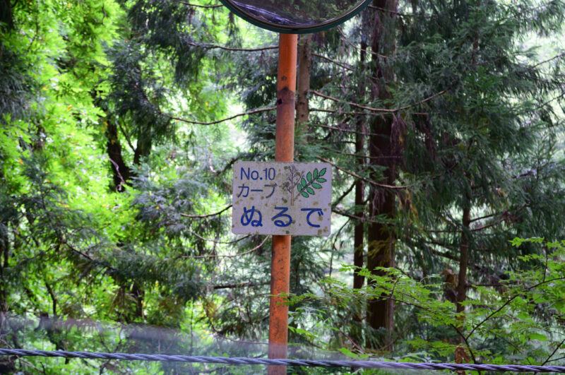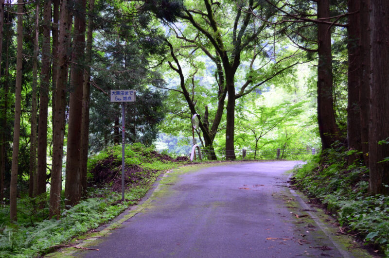 大栗田集落まで、残り6km。苔むした路面が何となく愛おしい。鬱蒼とした森を抜けると明るい道が待っている。それを体現しているようで、思わず見とれてしまった。しかも、路面右側の路肩には(両方か?)ちゃんと側溝も作られていたりして、ここは「県道」で、地味に管理されてます!ということを示してくれているようだ。