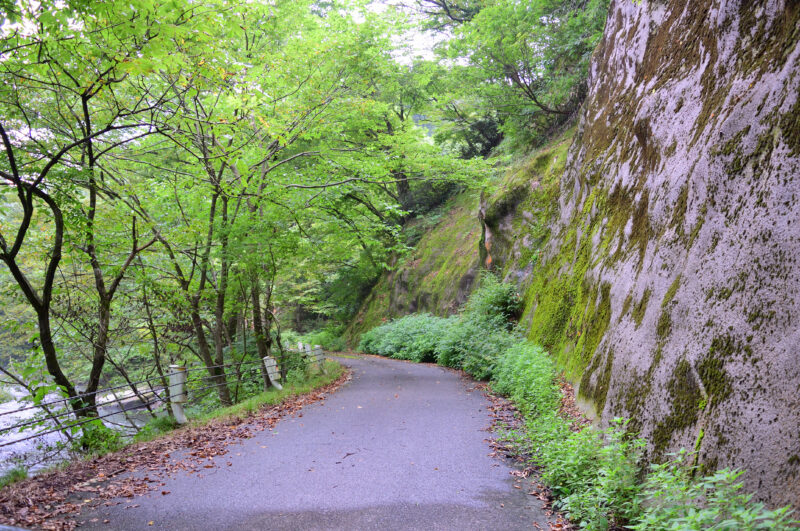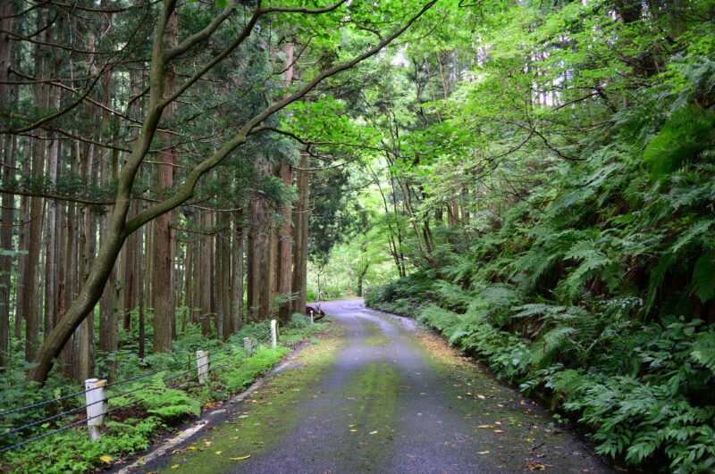 湿気の多い山中を走る県道。路面は苔むしてツルツルと滑りそう…。こんなところは車でも滑るので注意が必要だ。右の山側の斜面は石垣だろうか。草に覆われてよくわからないが…。左側の杉の林はきっちりと管理されているようで、下枝を刈り払われた立派な杉が生えている。今日はあいにくの曇り空だが、晴れた日だと木漏れ日が心地よさそうだ。