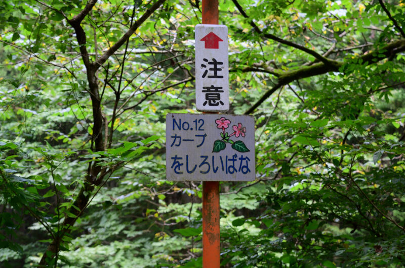 これ、なんだったかなぁ…。左側の路肩に立つ、黒い丸いもの。カーブミラーではないし…錆びついた標識だったかなぁ。沢を渡る小さい橋が見えて、その先には左カーブがあって、その前には警戒標識が見える。「右(又は左)つづら折りあり」か「左方屈曲あり」だろう。すると、この丸くて黒いものは「警笛鳴らせ」か「警笛区間」だろうか。それにしてもいい感じの道だ。こんな感じの道だと、のーんびりと散歩でもしたくなってしまうし、これが砂利道だと一昔前の国道のような雰囲気だ。三輪のミゼットでも走っていたら、非常にいい感じの風景になるだろうなぁ。