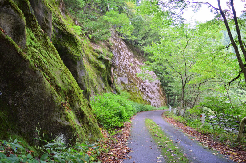 少し通り過ぎて振り返ってみる。そこにある風景は一般的に考えられている県道のそれではなく、どう見ても林道の風景。これが未舗装だったら最高なんだが…(と、良からぬことを考えるヤツ)。急角度の法面、岩がむき出しの斜面、そこを吹付けコンクリートでガッチリ補強している。表面の苔の明るい緑が目に明るい。こりゃ力業の補強だなぁ…