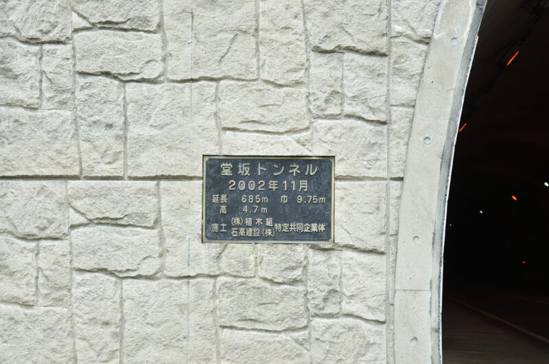まずは堂坂トンネルの銘板から。2002年11月竣工のトンネルだ。石を積み上げたかのような意匠が施されているが、見ての通りコンクリートに刻まれたものだ。このトンネルは2002年に竣工したわけだが、それまでは旧道の峠を通っていた。今回探索するのはその旧道だ。この道はもともと町道として着工したようだが、ほどなく工事中止となり、最終的に全通したのが昭和36年(1961年)という歴史を持つ、なかなか紆余曲折がある道のようだ。
