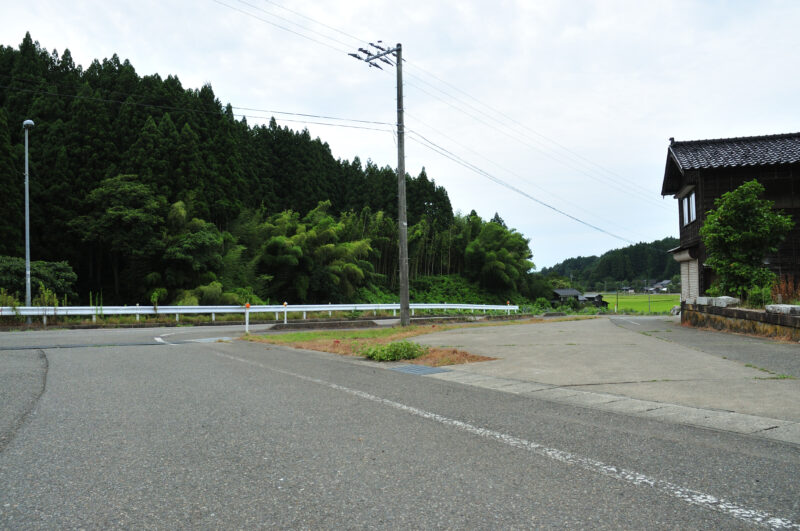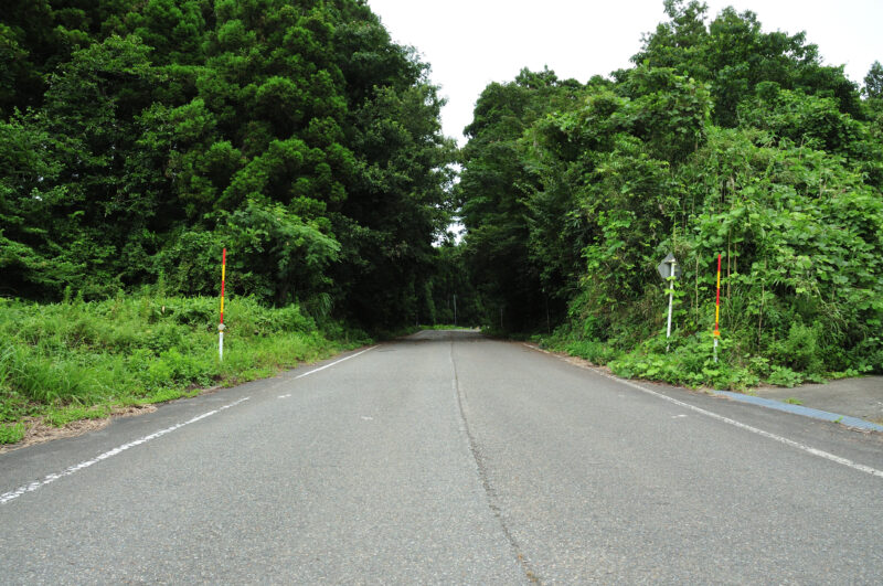 さて、ここが分岐点。奥に走っているガードレールが設置されている道が、堂坂トンネルへ向かう道だ。ということで、今、私が立っている道が旧道ということになる。おそらくだが、右側の不自然に広く、セメントで舗装してある部分はもともと道だったのだろう。ここが道と考えると、道形がものすごく自然になる。山の一番高いところを避けて、このカーブで左側の少し通しやすそうなところに道筋をずらして、そこを狙って通したんだろうということがわかる。