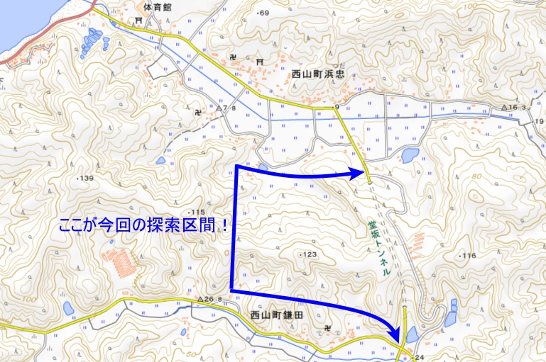 これが今回の探索範囲、堂坂トンネル。新潟県の西山町、左側にちょこっと見えている海岸部、ここを走る国道352号から分岐して内陸部の山の方に少し入ったところにあるトンネルだ。この堂坂トンネルと旧道が、今回の主人公。道自体はそんなに険道でもなく、いまだ現役の道なので過度に荒れ果ててもいないが、この道はどうしても辿ってみたかった。それが今回の探索理由だ。