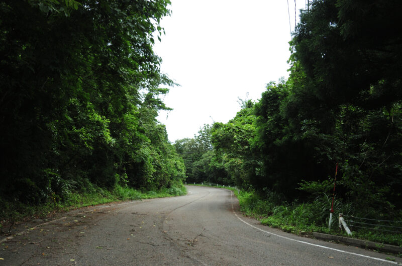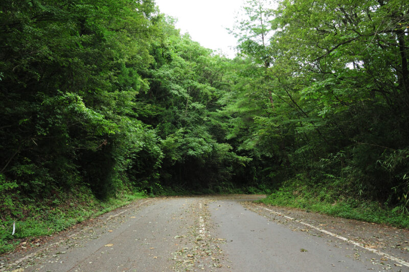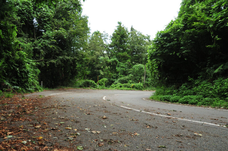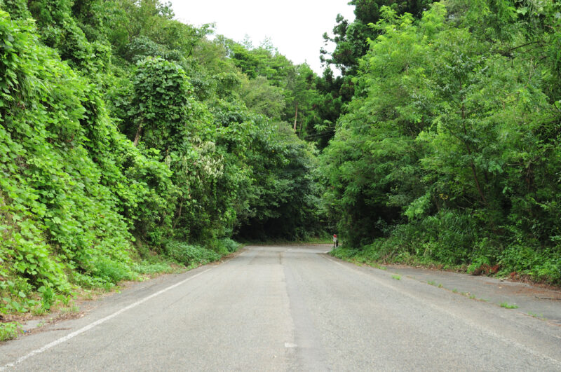 峠を過ぎて下っていく。画像右側には退避場、こんなに広い道幅だと「いらないんじゃないか?」と思ってしまうが、何かの理由で設置されているのだろう。森の中を進んでいく2車線の道。それは一見すると一級国道の旧道のようにも見えてしまうのだが、さにあらず。三桁県道の旧道だったりするのが実に面白い。こうして道のど真ん中に立って、道全体の風景を眺めることが出来るのも、旧道ならではの醍醐味だ。普通の道だとこうはいかない。…もっとも、経験上(とは言ってもそんなに深い経験ではないけど)こうして眺めていると、目の前に出てくるのはおおよそサルか、「シカども」だったりする。