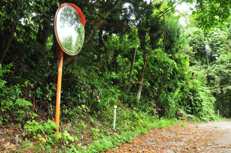 カーブの外側には、古ぼけたカーブミラー。旧道や廃道にはおおよそカーブミラーが残りがちだし、鏡面が無くなってしまったものを多く見てきた私としては、こうしてちゃんと旧道上で残っているカーブミラーは、なんとも嬉しいもんだ。路面に枯れ葉が山ほど積もっているのが気になるが…。おおっ!デリネータも立っているじゃないか。この辺り、峠の前よりも交通量は極端に少ないらしく、路面にも車が通ったような跡がない。その中で、このカーブミラーは通行する交通のために、ここにずっと立っているんだなぁ…。