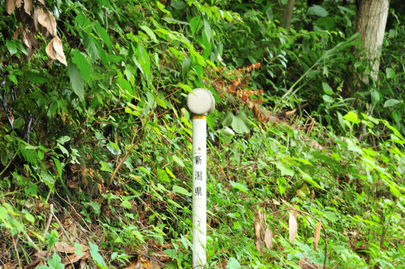 カーブミラーの脇にポツンと立つデリネータ。そこには…丸ゴシックだろうか。「新潟県」のステッカーがあってある。いろいろ新潟県の県道を巡ってきたが、この文字もいろんなパターンがわかってきた。これは丸ゴシックだけど、このほかに普通のゴシック、明朝なんてのもある。これにはどんな違いがあるのかわからない。新しければ丸ゴシックなのか?と言うとそうでもないし、明朝だから古いかと言うとそうでもない。この辺がわかればデリネータの設置年がわかるので、道の歴史を紐解くにも助かるんだけどなぁ…。