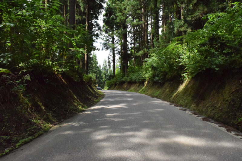 森の中に突っ込んで行く道を辿っていくと、こんな道が待っていた。道幅は一気に狭くなり、おおよそ一車線半と言ったところかな。離合はまず出来ないので、車で来る場合は注意が必要だ。左右の切り通しが実にいい、素敵な風景だ。…この道、勾配を緩やかにするために、ここだけ切り下げて道を通したんだろうか。道の雰囲気はとても安定していて、崩れた感じもない。中越地震の時も、ここは無事だったんだろうな。この風景が残っていて良かったと、思わず感謝をしてしまう。