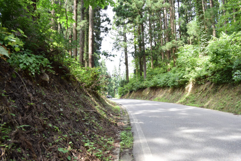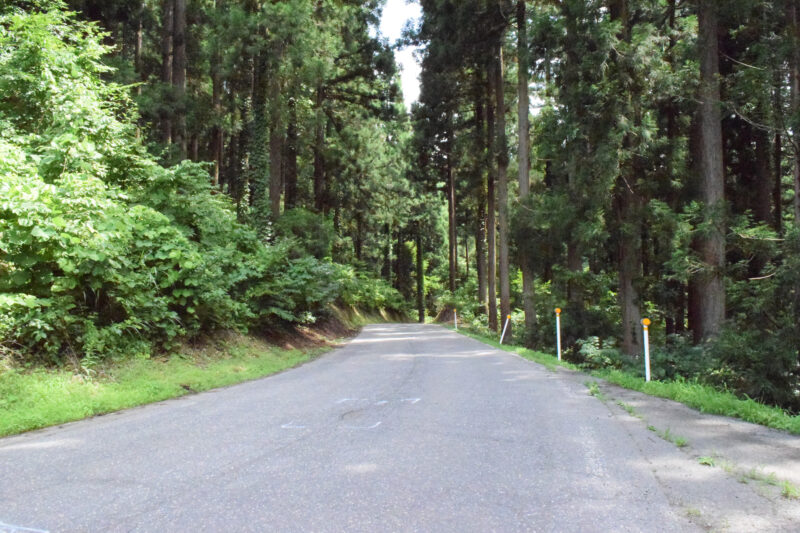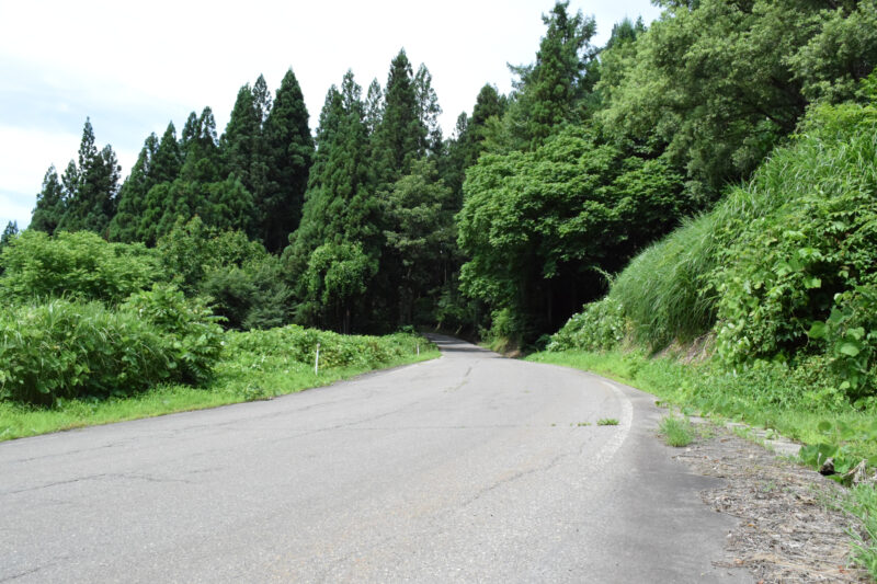 名前もない峠を過ぎると、またもや道幅が広くなって、杉林に囲まれた美しい道に変わる。下枝はほとんど払われているように見えるから、林業の作業道としても活躍しているようだ。路肩には規則的に並ぶデリニエータ。そのデリニエータには「新潟県」の文字。たまーに傾いたものもあったりして、こりゃ多分雪で傾いたんだな…とか、自然動物でも当たったかな?などと考えるのも、また楽しい。今日は車で探索しているが、自転車だったりして、山側からヌッとクマさんでも出てこられた日には…などと、つい考えてしまう。探索しづらくなったもんだなぁ。