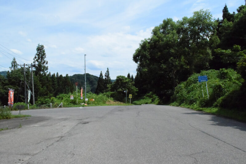 ここは五十子平。ここに来ると、思わず直進してしまいそうだが、県道はここから左に折れる。この前に一度分岐点はあるのだが、そこはなぜか撮影していなかったので、ここは2か所目の分岐になる。この道が本当に険道になるのか?といささか心配になってしまうが、ひとまず先に進んでみよう。ちなみにここを直進すると松之山下蝦池(しもえびいけ)の集落を過ぎて、最初に登場してきた高館トンネルを出たところに合流してしまう。県道でもなくなってしまうので注意が必要だ。