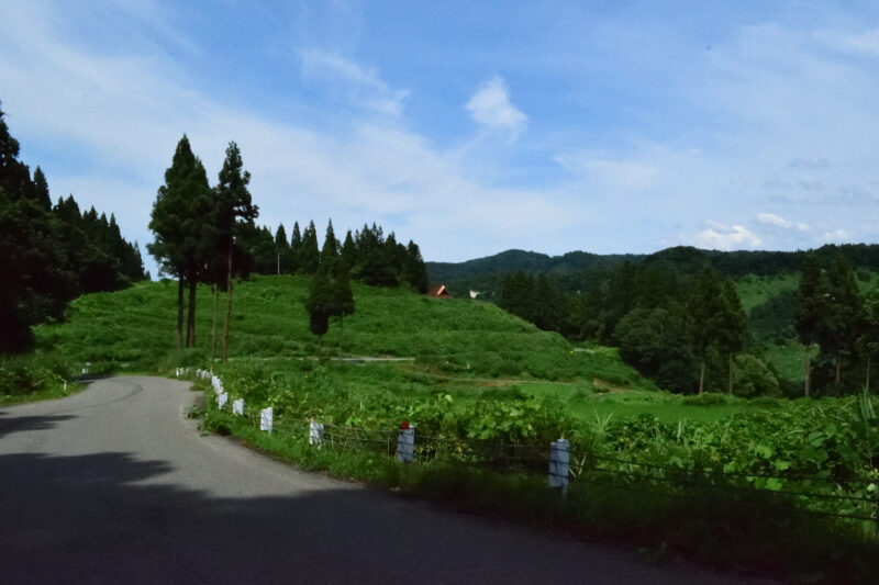 左折すると、このように雄大な景色が広がる。画像がいささか解像度が低いのはなぜだろう。一番解像度が高いカメラで撮影したはずなのだが…。それにしても、青空と緑のコントラストが非常に美しい。その中を進む県道は、なんだか高原の道みたいで、一見すると観光地みたいだ。それにここは、近くの集落の方々によって営農がされており、そのせいか、きちんと土地が管理されている印象を受けた。それもあるのかな、この風景が田舎育ちの私にとっては、なんだかすごく懐かしく思えるのは、気のせいではないと思う。その集落は、この県道の路線名にもなっている五十子平(いかごだいら)。