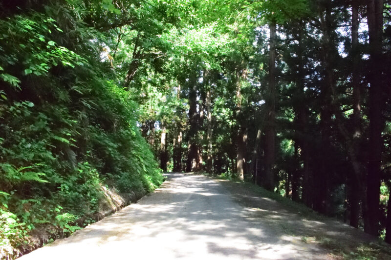 暖かな木漏れ日が差し込む明るい道を、のんびりと進んでいく。ここは未成道か、それとも現役の道か。こんな道を以前にも見たような気がする。さて、どこだったか…。一般県道178号山ノ相川下条停車場線の未開通区間だったか。なんとなく雰囲気が似ていて、懐かしささえ覚える。路面の左側に見える側溝は綺麗に整備されているし、その昔の集落間を結ぶ道は、今も立派に生きていた。素晴らしい!。かつてはここを人や車や荷車が行き来していたんだろうな。なんだろう、やっぱり昔から大切だった道と言うのは道の造り方自体がしっかりしていて、そうそう簡単に崩れないような気がする。