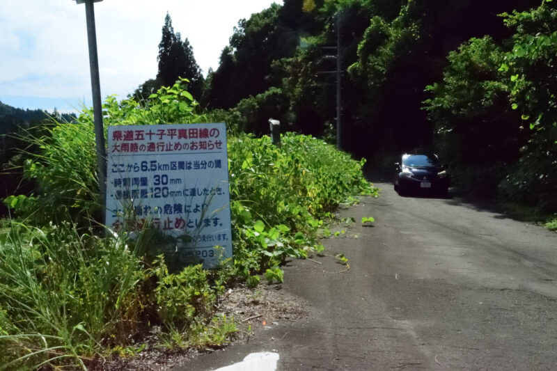路肩に車を停めて、背中を向けた看板を前に回って見てみると、それは異常気象時通行規制の看板。「ここから6.5km区間は当分の間、時間雨量30ミリ、累積雨量120ミリに達したとき、土砂崩れの危険により全面通行止めとします」とある。時間雨量30ミリとなると、近年の大雨ではすぐに到達しそうな雨量でもあるので心配なところだ。しかし…この「当分の間」ってのが、なんともはっきりしない言い方で気になる。この「当分の間」ってのは「しばらくそのままですよ」と言うことだったりするのだ。長いこと通行止めになっている区間も、調べてみると「当分の間」通行止めとなって、既に20年以上の時間が経過しているものもあるからねぇ…。