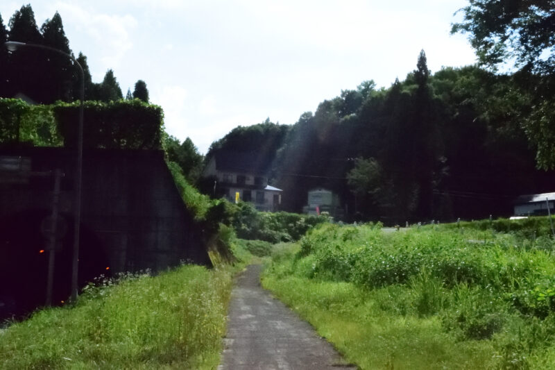 合流点の付近をウロウロしていると、こんな道を見つける。こりゃあ雰囲気からして、どちらかの旧道だろうか。車を停めてポツポツ歩いてみると、昔の道を歩いているようで実に楽しかった。右側にガードロープの支柱が見えるが、あれが地図で言うと名ヶ山トンネルの坑口の上を通って、松代に向かう側の車線に合流するように作られている県道だ。