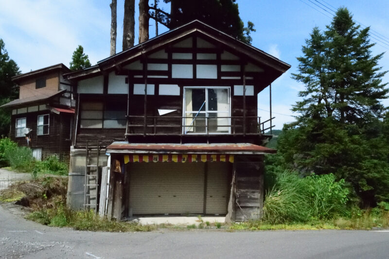 五十子平の集落の県道の交差点にあった廃屋。集落の中で中心部にあり、県道との交差点に面していたことから、旧くは集落の中で中心的な商店だったんじゃないかなぁと思われる。建物自体は多少歪んではいるものの、正面の白壁の造りなんか素晴らしい。正面の入口には日除けのテントがあって、今では見られないような赤と黄色の色合い!(誉め言葉だ)。営業されてた頃は、多くの人が訪れたのかなとか、駄菓子なんかあったりして、小さな子供で賑わってたのかななどと想像してしまう。こういった建造物はぜひ行政の手で保存してほしいなと思うが…難しいのかな。