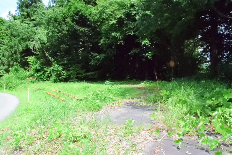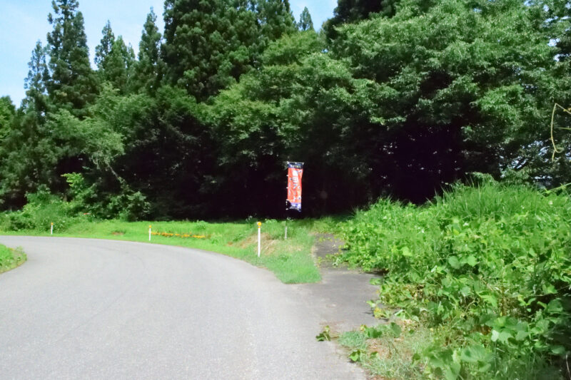 ん…カーブの右側に伸びるアスファルトは何だろう?。それに、正面に見える幟(のぼり)の奥に、微かだが何かあるように見える。この県道の跡だろうか。もしかして、ここから直進していたのか?!などと思い、車から降りて、喜び勇んで細く残ったアスファルトを辿りながら奥へと足を進めていくと、そこには…!