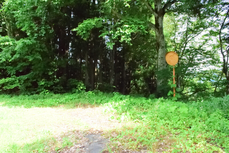 茂みの中に突っ込んで行くアスファルト。これはもしかして!と期待を膨らませて進んでいくと、茂みの暗闇の向こう側に見えたものは…カーブミラー?。それにしては光っているものが全然なくて、ここから見えるのは黄色い丸のみになっているなぁ。もしかして鏡面が落ちているのか?。そうか、ここは旧路盤の跡で、もともとこの左カーブは結構な急角度になっていたんだな。それを…おそらく山側を削ってカーブを緩やかにして…と見た。この道は険道ではあるけど、こうしてちょいちょい細かい改修が行われているようで、この道はやがて通りやすい重要な道になるのかもしれない。