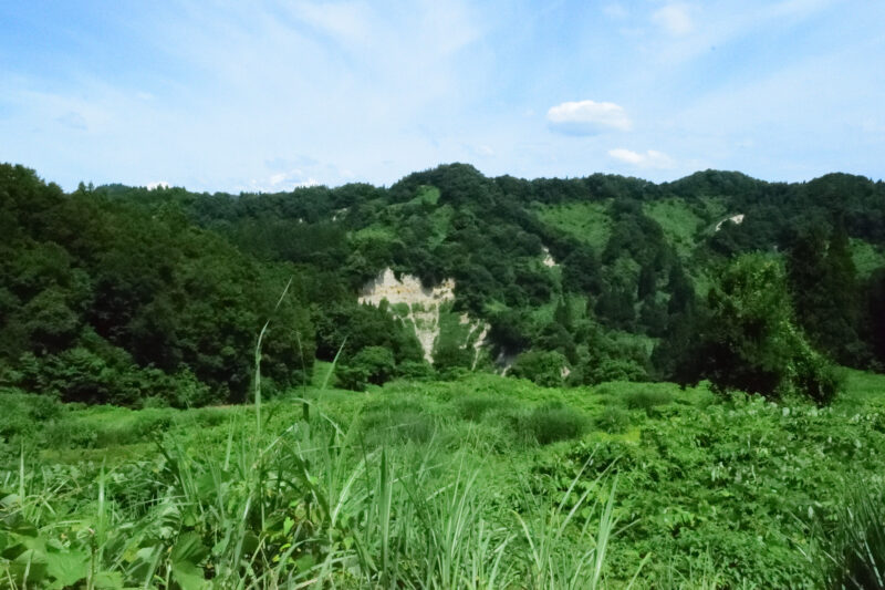 ん~…実に美しい。けど、山肌に木々が茂っているところと、鮮やかな緑のところとある。正面にはつい最近崩れた斜面の跡。おそらくだが…鮮やかな緑のところは中越地震で滑ったところなのかもしれない。もしそうだとすると…これだけあっちこっちで滑ったんだ…。強大な自然の、地震と言う力に畏怖を覚える。今は非常に穏やかな山の景色だが、ひとたび自然が牙を剥くと人間なんか敵わない。まして山にくっついている道なら、山が崩れればひとたまりもないだろう。そうして崩れた道はそう簡単には戻せないし、そういった道が廃道になる。