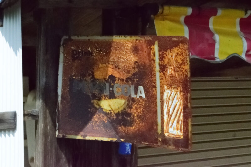 柱に固定された、飲料製品の看板。今も盛業中の会社で、私もよくお世話になっている美味しい製品だ。表面は錆びてみる面影もないが、それでもちゃんと判別できるというのはすごい。お店が閉まってからも、この製品をアピールし続けるって、同じようなブリキの看板が今でも多く残っていることの証ではないか、などと思ったりした。この看板で、どのくらい時間が過ぎているのか。それは、この錆が物語っているような気がする。