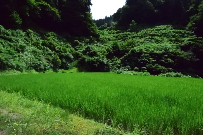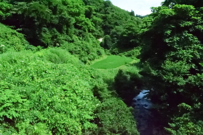 緑に包まれた田圃の風景。こうしてみると、以前はこの田圃の上方にも段々に田圃が広がっていたのかもしれない。なんとなくそういう雰囲気を持った場所のように思われる。その中で唯一ここだけは田圃で、今も水稲が栽培されている立派な田圃だ。近くに民家は少ないので、田圃の管理だけでも大変だと思うが…。最近はクマも多いので、ぜひ注意されて美味しいお米を作っていただきたいものだ。