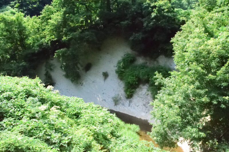 おお!、この白き壁の護岸はなんだ!。石灰石だろうか。緑にあふれた(溢れすぎているという話もあるが)周囲の景色の中で、この白い壁はひときわ目を引く。ここなんか、少し整備すれば立派な観光資源になるのになぁ…と思ってしまう。思うに、この周辺(十日町市、松代地域、松之山地域)は地質に特徴がある地域と聞く。そのため、こんな素敵な川の風景があるんだろうな。