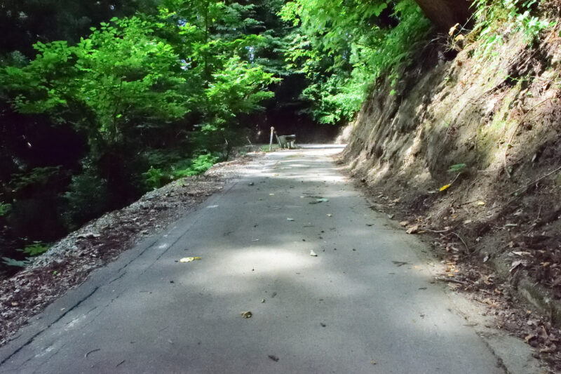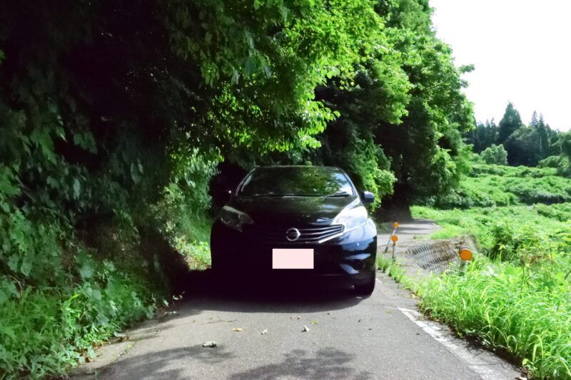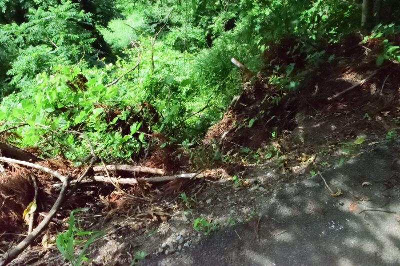 車の幅いっぱいの道幅。おおよそ2メートルくらいかな。ここも路肩が補強されている。こういった県道でも崩れれば、こうしてきちんと補修しているところが素晴らしい。それにしても、この道幅の狭さ。こりゃ4トンの貨物車は通行できないかもしれない。仮に通ることが出来たとしても、この狭さではいつ脱輪するか、ヒヤヒヤもんだろう。だから自動車交通不能区間なのか…。