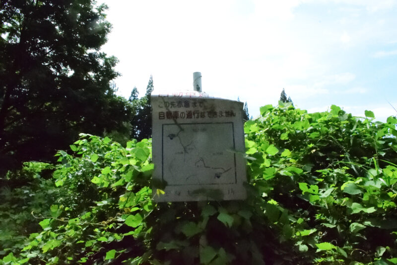 道端に傷んだ看板を見つける。絡んだ草を少し取り除き、よーく見てみると…「この先赤倉まで自動車の通行は出来ません」とある。つまり、ここまでが自動車交通不能区間と言うことらしい。確かに狭かった…。自動車交通不能区間にもいろいろあって、こうして軽自動車くらいなら通行できる道や、ホントに人一人しか通行できない小径が県道に指定されていることもある。もちろん、私はその「人一人しか通行できないような県道」に、大いにときめくのだが(笑)。仮にその道が崩れていたとしても、その規模が多少なら越えてしまうが、もちろん「安全第一」が再優先なのは言うまでもない。