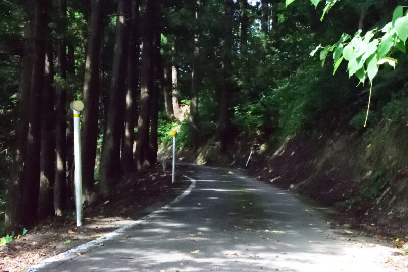 何とも雰囲気の良いところに出た。標高が高くなるにつれて失われていった日陰だが、ここは豊富にあるので、休憩にピッタリだ。脚の長いデリネータが特徴的だ。普通の1.5倍の長さがあるデリニエータの脚。なんでこんなに長いんだろう?。積雪の対応のためかなぁ?。でも、ここは真冬の積雪のころになると、冬季通行止めになって入れなくなるはずだが…。休憩しようかとも思ったが、この付近に車を停める場所がなかったので、そのまま通り過ぎることにした。