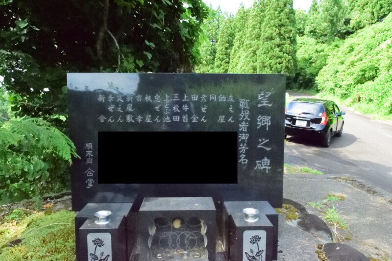 ゆっくりと車を走らせて撮影していると、峠に近い左側の路肩に広場があって、そこに「望郷の碑」と言う石碑があった。その名前に惹かれて見てみると、「戦没者御芳名」の文字と共に刻まれた15名の方々の御芳名。深々と拝礼し、手を合わせてご冥福を祈ると、改めて碑を眺めた。15名の方々のお名前が記されている。お名前の上に記されているのは、おそらく地名だろう。この集落からも、大勢の方々が戦地に赴かれたんだなぁ…と思いながら、この碑の裏側を見てみる。そこには…