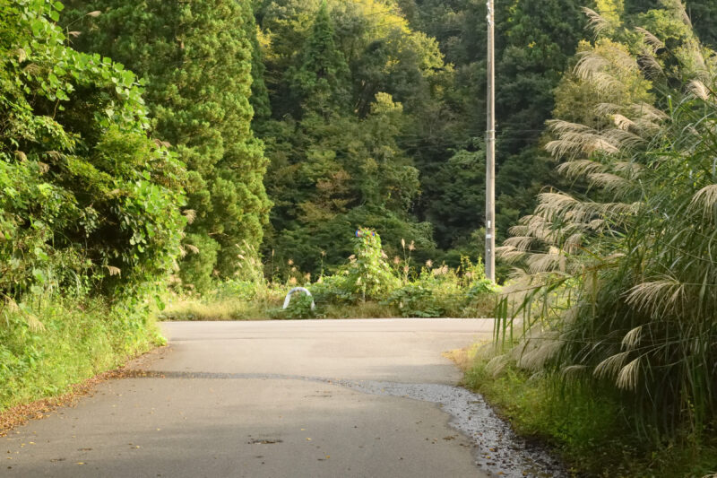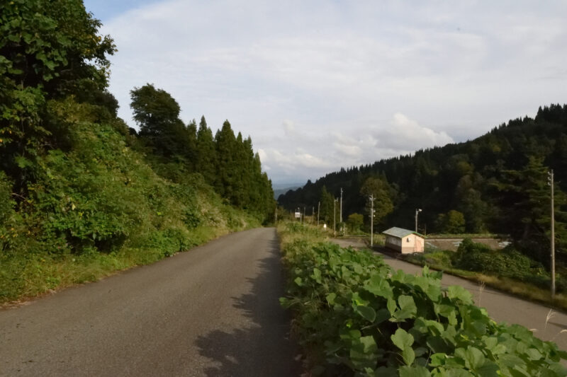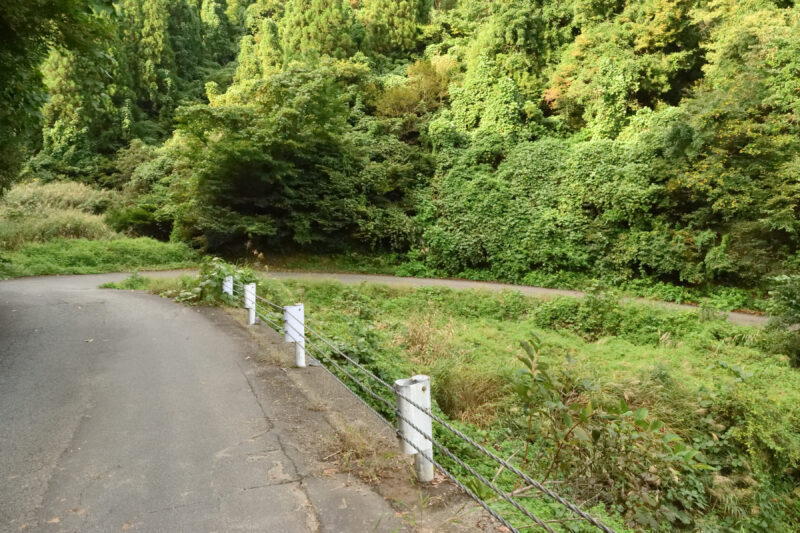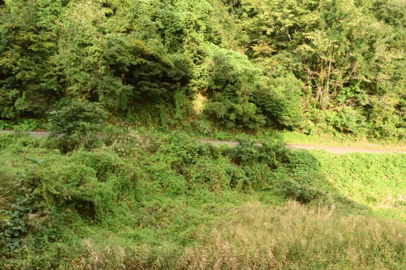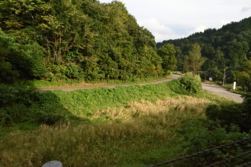 手前は…以前は田圃だったのだろうか。いい感じで平地になっていたりして、この高い山の土地でさえ、以前は耕作されていたんだなぁと思うと感慨深い。きっと今の時季は、金色の稲穂が風にそよいでいたことだろう。その頃は、人もクマも上手に共生していた時代。お互いにこの山の中で生きていることを尊重し、お互いに山から恵を受けて生きていることを喜んでいたから、共生出来ていたのかなぁと、ふと思う。そこに、この道が多くの交通を通し、農機具をこの標高の高いところまで上げることを可能にして、ここで米を作っていた。水はミネラル分たっぷりの、山の湧き水だっただろうから、それで出来たお米が美味しくないわけがない。…この道のそばで育ったお米を、一度食べてみたかった。そう思った。